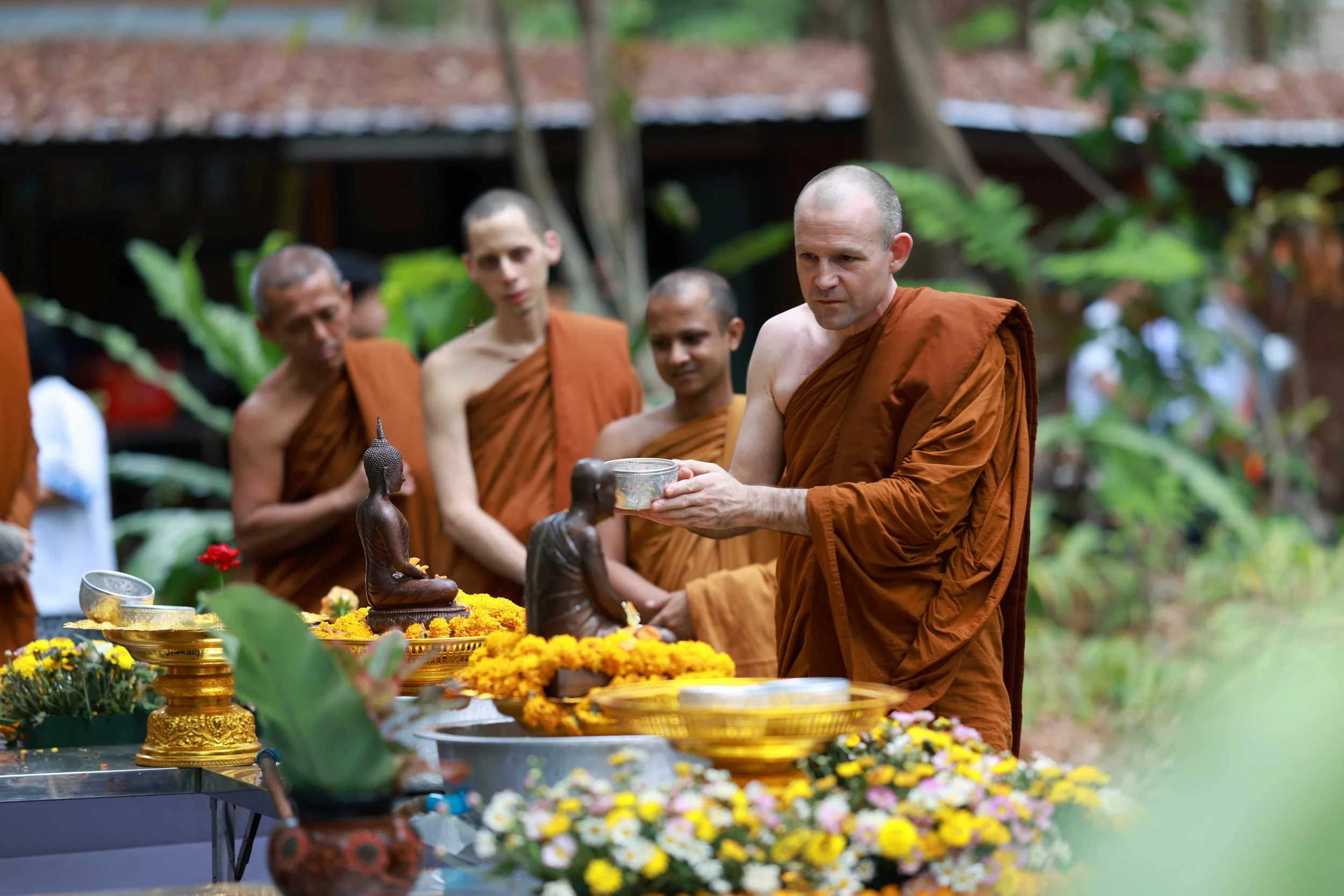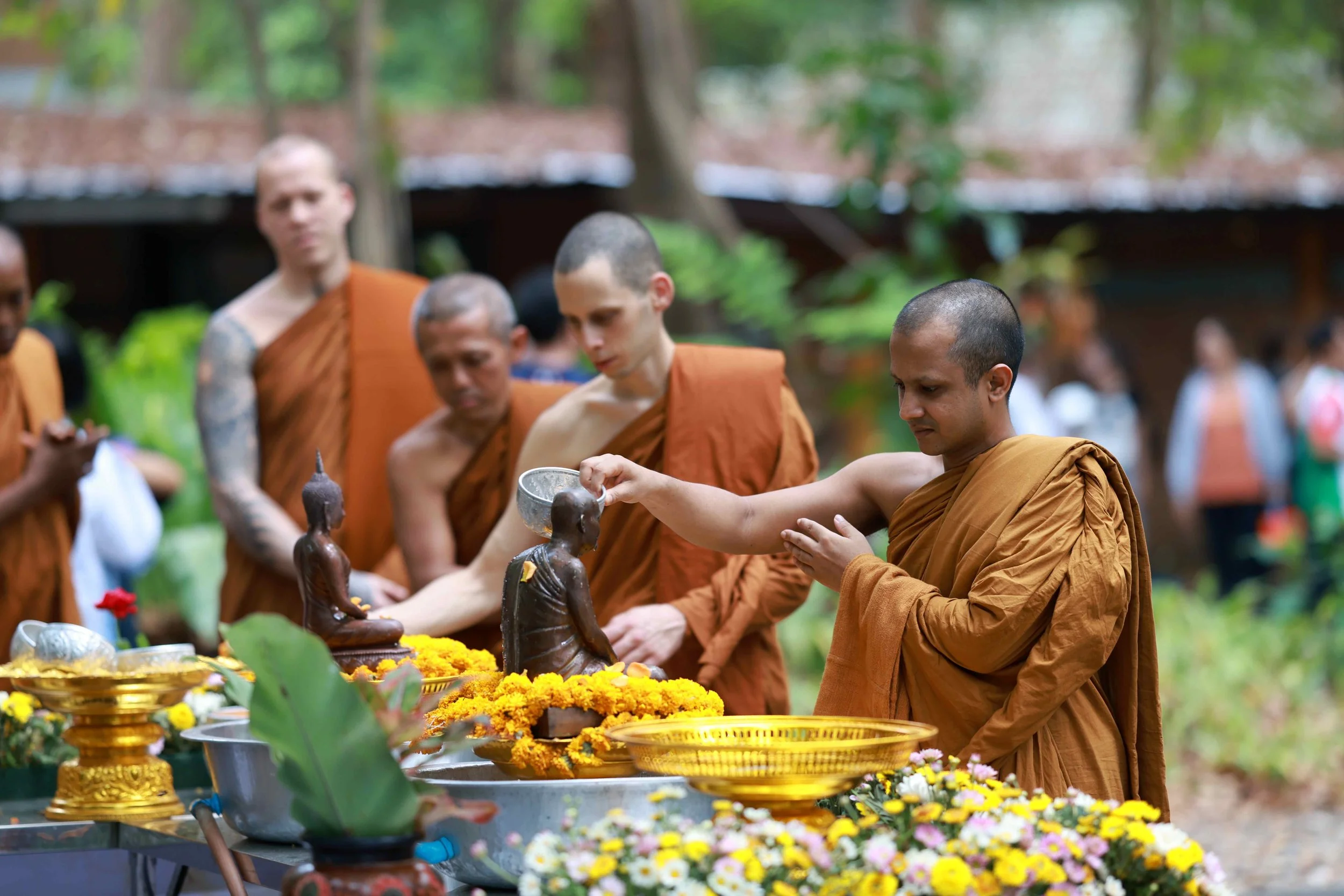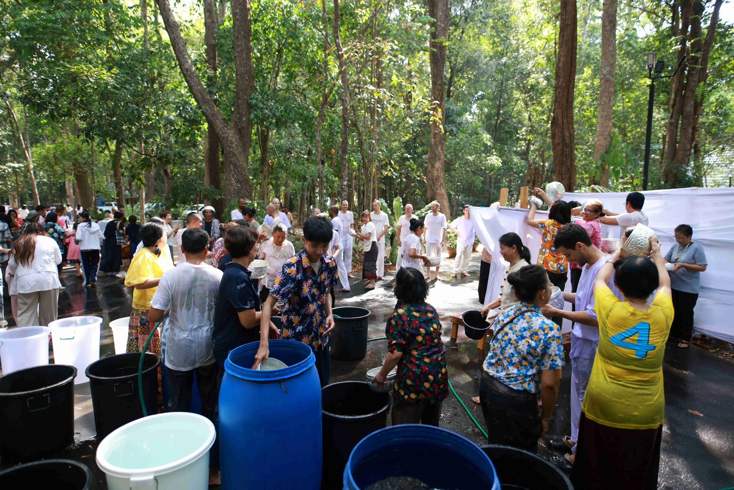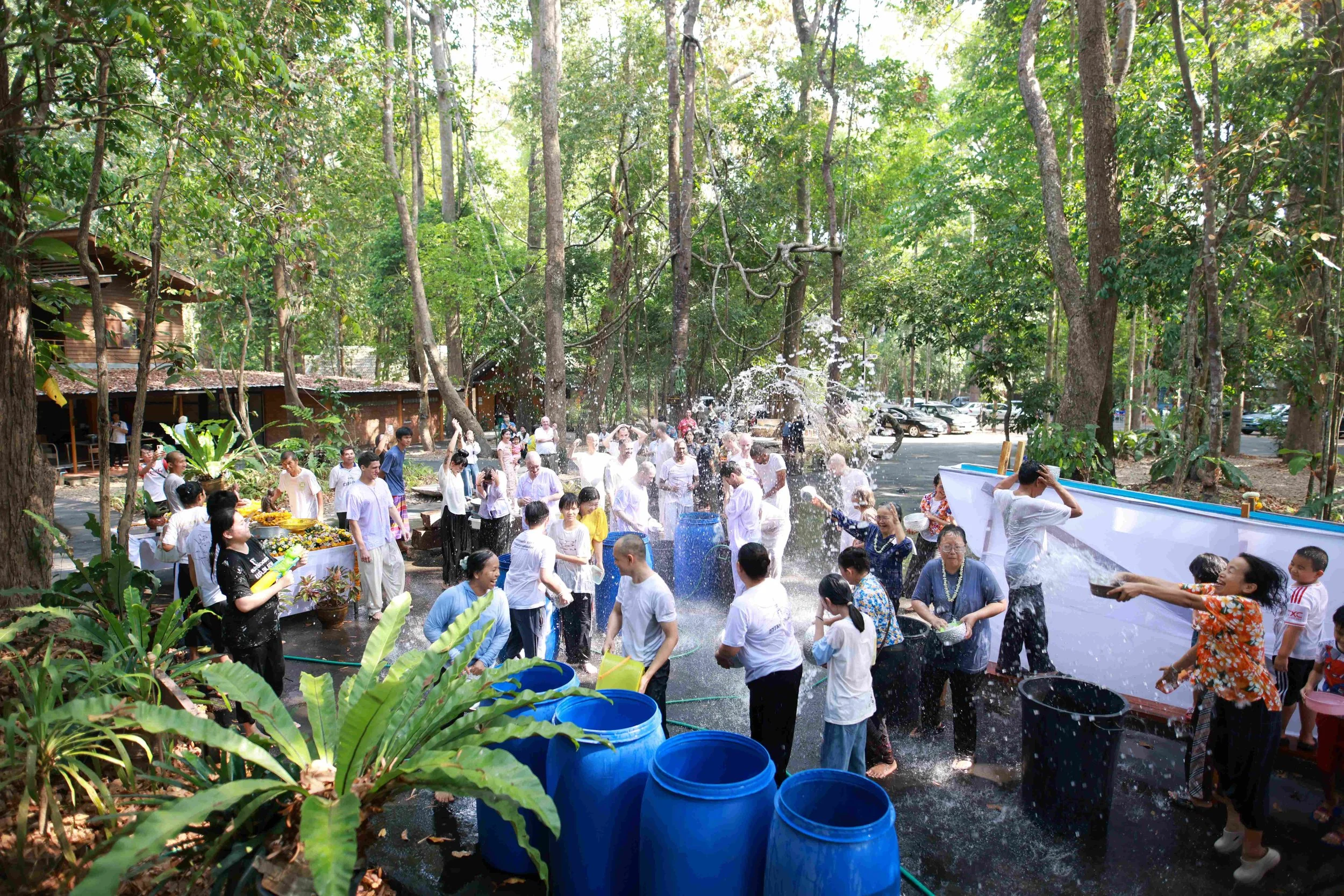 In Wat Pah Nanachat - ever since it’s founding in 1975 - the monks receive a full bath on Songkran, clothed in their traditional bathing cloths, sitting sheltered in a shielded off area under the stream of water poured down on them them from the outside. Inside the male village elders (the “por-orgs”), give them a full washing with soap and a swift massage of back and limbs under the cool flow of water. Outside the whole community gradually becomes soaking wet, as sooner or later everyone mutually splashes each other in a feast of waterblessing.