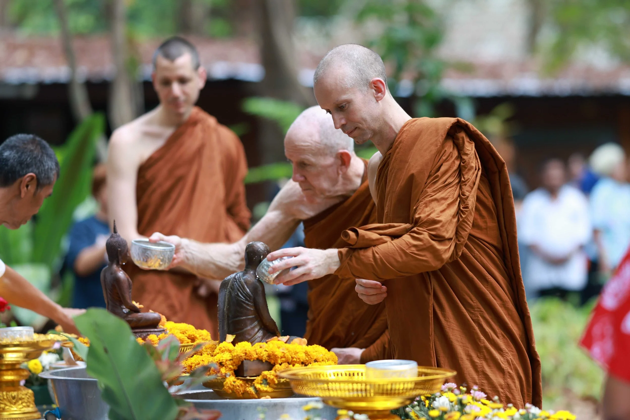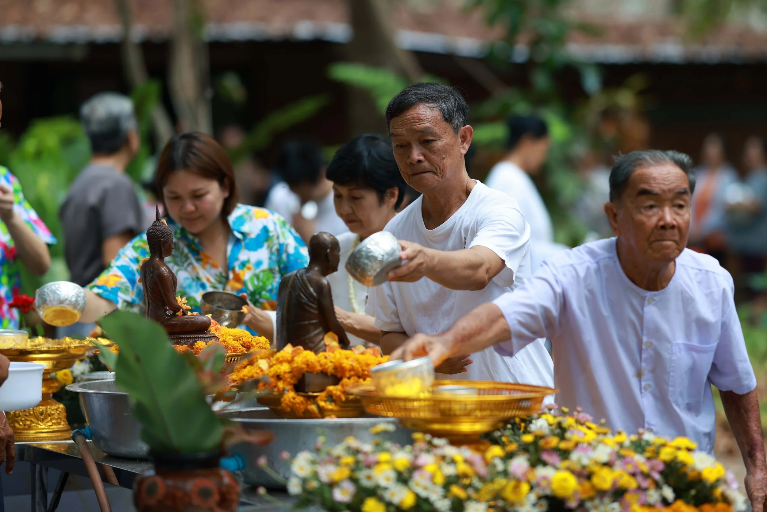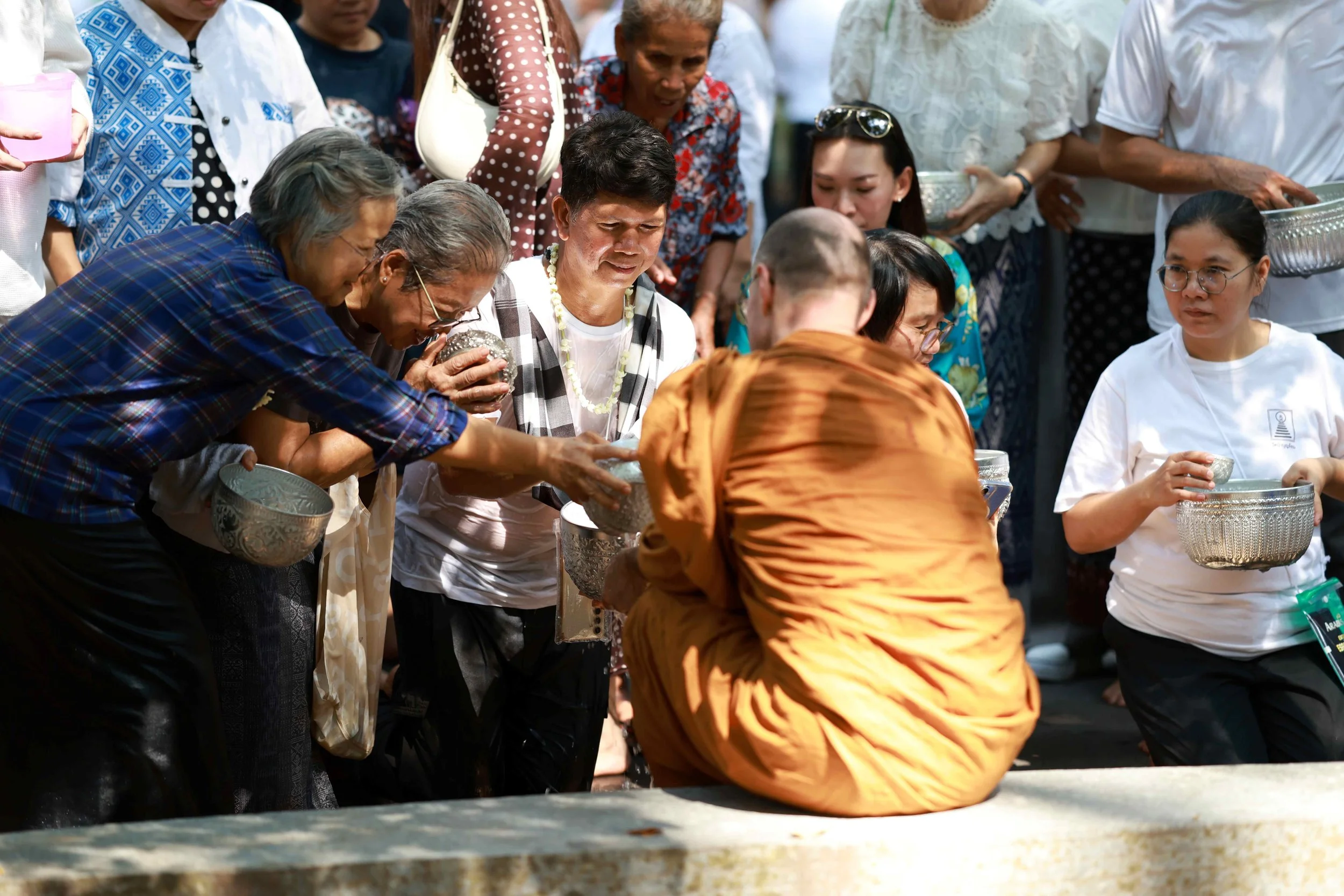 Traditionally, on Thai New Year (“Songkran”) in the peak of the hot season, the younger generation pours cool fragrant water over the hands of their parents, grand parents and village elders, paying respect, asking for forgiveness and expressing their gratitude. In many monasteries the ritual of water pouring begins with “bathing” Buddha-images and then the monks and novices, who, joyfully receiving the cool water, extend their new years blessings over the lay community.